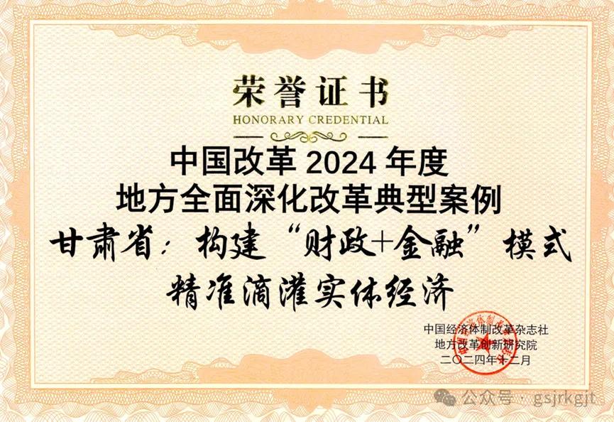 新甘肃客户端兰州讯(新甘肃·甘肃日报记者曹立萍)日前,甘肃省构建“财政+金融”模式精准滴灌实体经济案例入选“中国改革2024年度案例”。这是此次我省入选15个改革案例中,唯一一个涉及财政金融领域的改革案例。