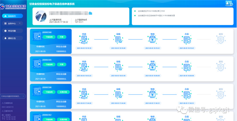 近日,金控担保电子投标保函系统在临夏公共资源交易中心首发试点上线,金控临夏担保当日开出第一单电子投标保函。截至8月9日,在线开具电子投标保函共19笔、金额275万元,实现了1分钟线上保函开具,做到了“数据多跑腿、群众不跑路”。